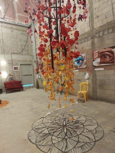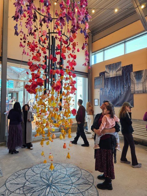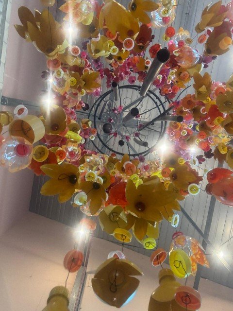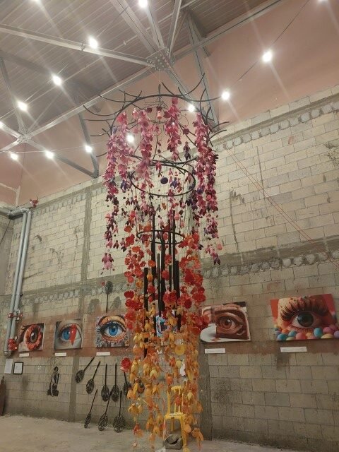 ״בין שמיים לארץ״ היא נברשת יצירה מרהיבה התלויה במרחב, בגובה של כ־4 מטרים, ונעה בין קלילות לאדמה, בין פסולת ליופי, בין חומר יומיומי לחוויה מרוממת.