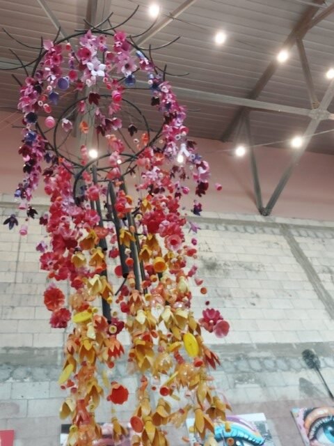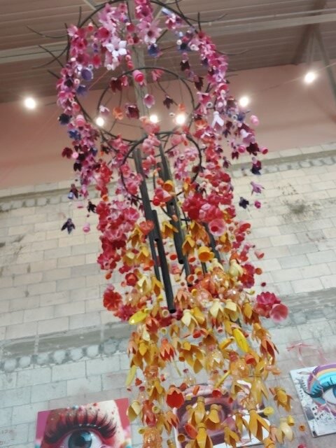 היצירה מורכבת מפרחים שנוצרו מבקבוקי פלסטיק משומשים, פקקים וצינורות השקיה – חומרים שנלקחו מעולם הצריכה והחקלאות ועברו טרנספורמציה אמנותית.