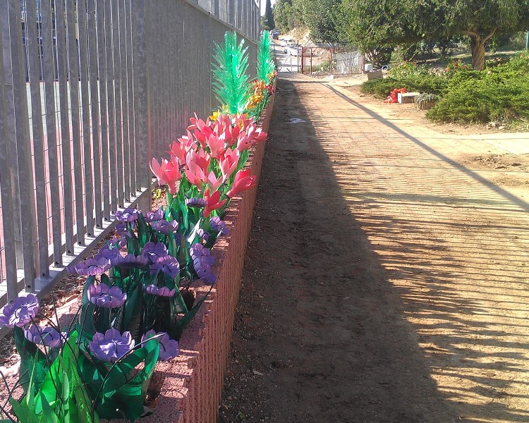 ערוגה בנויה זו, באורך 50 מטרים , נוצרה כחלק משיפור פני החצר בבית הספר המיוחד בקיבוץ צרעה, שנים נעשו נסיונות להצמיח פרחים טבעיים בערוגות אך השמש הישירה לא נתנה להם הזדמנות לשרוד זמן רב. הפרחים הייחודיים שלנו, שעשויים ממאות בקבוקי פלסטיק ממוחזרים הפכו לפתרון מושלם במקרה זה. החצר הפכה מזמינה וצבעונית ואף עם ערך מוסף חינוכי : יצרנו עם שתי הכיתות המקדמות בבית הספר, כ-18 תלמידים מקסימים, 18 פרחים מיוחדים. 18 פרחים הצבועים באופן ייחודי ומקורי על ידי כל ילד. את הפרחים המיוחדים שתלנו בין פרחי הגינה ה"רגילים" ויצרנו למעשה גינה המשקפת את היותנו חברה רב גונית וססגונית היכולה וצריכה לחבק לתוכה את השונה והאחר. הילדים המיוחדים הרגישו סיפוק רב וגאווה מהפרוייקט הייחודי שזכינו לבצע