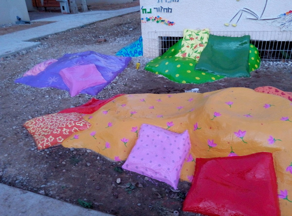 פינת הדברות- פרוייקט בבית ספר אבני חן במודיעין בו יצרנו פסל מרבץ ישיבה וטיפוס מבטון מוחלק על קונסטרוקציה של צמיגים משומשים, פסולת בניין ,פלסטיק ובקבוקים. יצרנו מרבץ משתרע של שלל שונות כריות צבעוניות המפוסלות מבטון ויוצרות אזור לישיבה, משחק ודילוג בתחושה חמימה וביתית. למעשה, העבודה הזו יצרה דינמיקה חדשה במרחב הבית ספרי, בו ניתן להתמהמה, לשהות ולשוחח. הפיסול של הכריות נעשה במכוון באופן בו יווצרו דינמיקות שיח כמו שיחה זוגית או בקבוצה של שלושה ילדים וכו